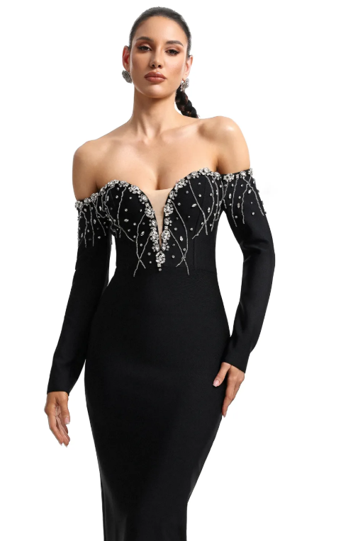 Make a grand entrance in the Yuhie Deep V Off-Shoulder Long Sleeve Embellished Bandage Maxi Dress. Featuring a dramatic deep V neckline and a figure-hugging bandage fit, this dress beautifully accentuates your silhouette while exuding sophistication. The off-shoulder design and long sleeves add a touch of elegance, while intricate embellishments bring a luxurious, sparkling finish. Perfect for evening events, formal gatherings, or special occasions, pair it with statement heels and minimal accessories to let the dazzling details shine and create a timeless, head-turning look.